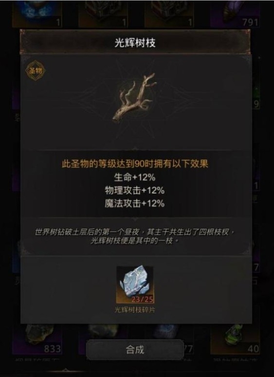 总之就是最后的葬途要完成,这样才可以获得光辉树枝,这个属性加成还是很全面的,魔法物理生命都很不错的数据。