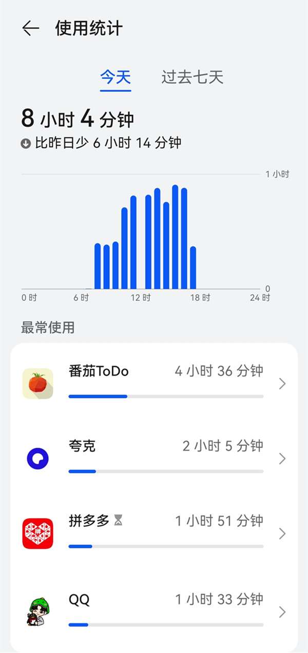 3、在这里就可以看到当天或是过去七天内的屏幕使用时间详情了。