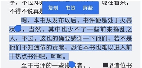 2、进入于都页面之后,长按想要添加书签的某一段,软件就会自动全选段落,点击书签即可添加成功;