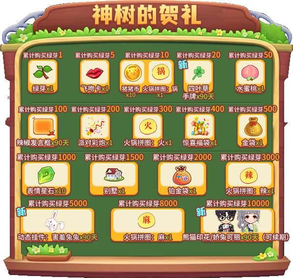 活动期间,根据您在“祈愿神树”购买绿芽的数量,领取神树的贺礼!并且还将对小伙伴们购买绿芽的数量进行排名,在活动结束后,为排行榜上前100名玩家发放奖励!