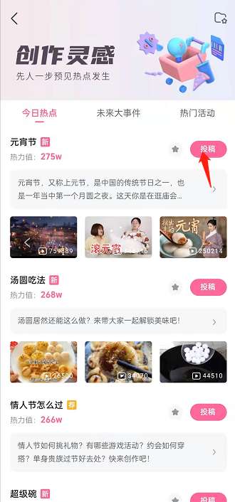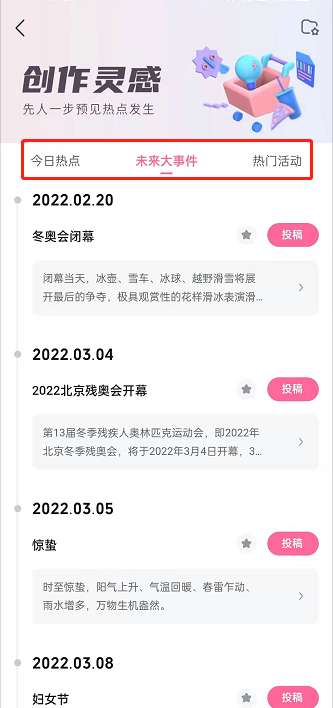 3、在上方你还能切换事件进行投稿和寻找创作灵感。