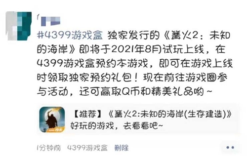 在4399游戏盒预约并带上指定文案分享《篝火2:未知的海岸》预约页面至QQ空间/微信朋友圈/微博等社交平台,于本贴下方回复分享《篝火2:未知的海岸》的截图(如图所示),我们将抽取满足条件的楼层,送上本次活动礼品!