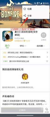 1、在4399游戏盒预约《篝火2:未知的海岸》并点击右上角“分享”按钮