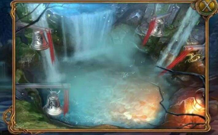 7、得到领导以后,来到温泉这边,给第四个横杆挂上银铃,再按照它演示的顺序点亮每个铃铛,完成以后池底的水消失,得到地窖雕像头部。