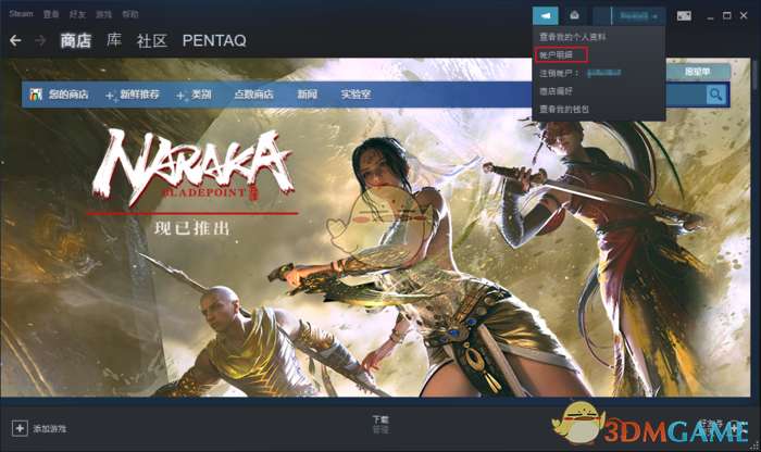 1、首先打开Steam,点击用户名,选择账户明细。