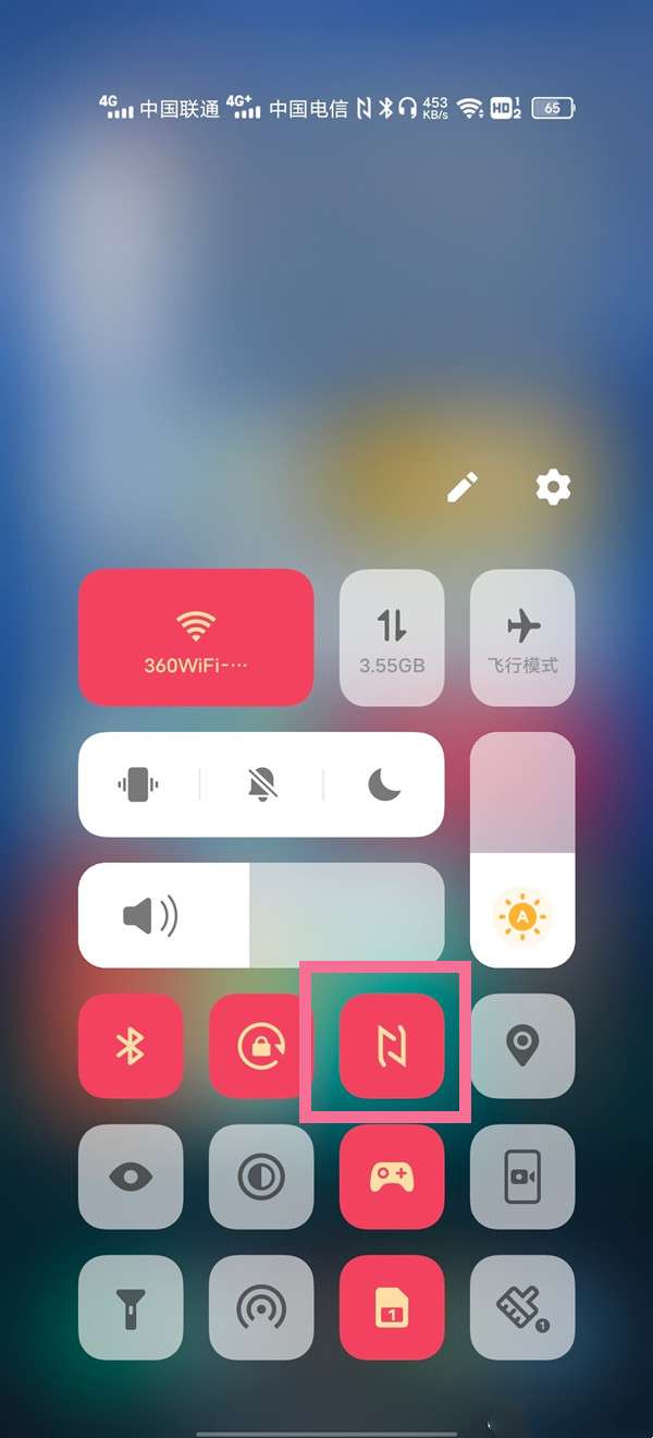 3、也可以从屏幕顶部下滑,打开控制中心,点击NFC图标开启。