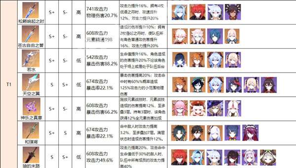 1:t0级别,雾切之回光,护摩之杖,飞雷之弦振,冬极白星,磐岩结绿,薙草之导光,终末嗟叹之诗;