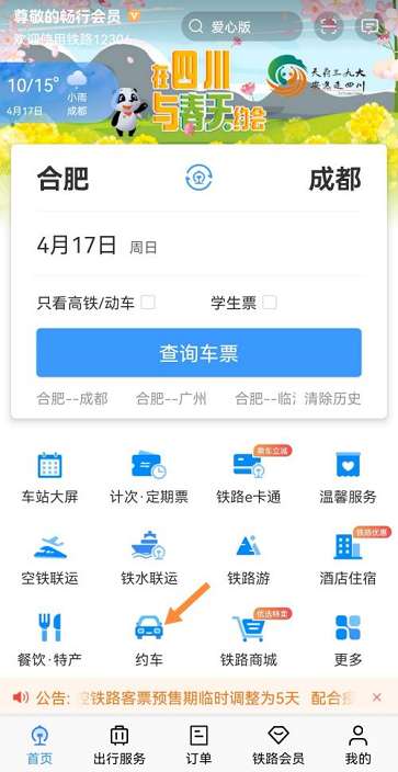 第一步:打开手机上的铁路12306app,进入首页,点击约车(如图所示)。