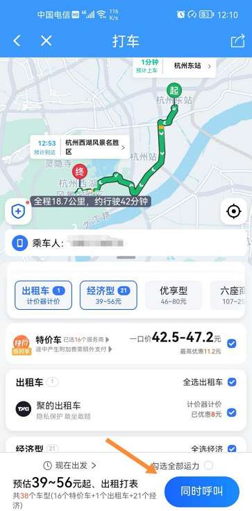 第三步:输入地址后,会跳转到打车选择界面,选择你想选择的车型然后点击同时呼叫即可(如图所示)。