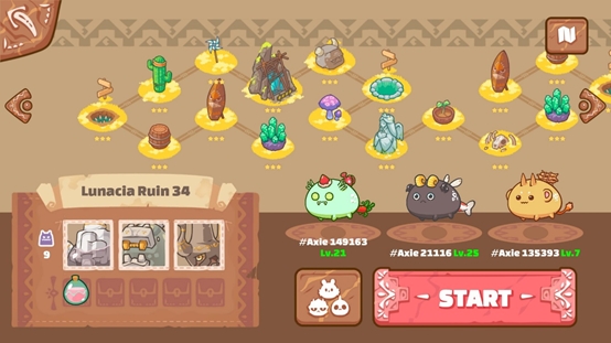 在冒险模式下有36个关卡。需要通过当前关卡才能继续下一关。如果无法通过某一关卡,不要担心,每赢一次您都会获得经验值,这将使您的Axie在冒险模式中不断升级。每升一级,它们的技能/属性都会增加。到目前为止,Axie可以达到的最大等级为25。不同关卡奖励不同数量的SLP,最高一次可赢得20SLP。