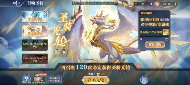 活动内容:圣骑卡池开放,120次召唤必定获得对应圣骑精灵;累计召唤进度还可领取对应圣骑专属神器*2、专属精灵之魂!