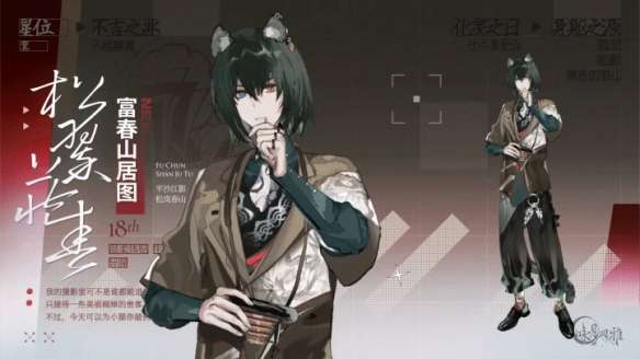 1.祝者介绍 祝者【晨星/暮星】:《富春山居图》 "神官,就算是摄影之时,也请不要太过接近在下。另一个我,有可能会伤害到你。" 在荼靡俱乐部中,有一位借名于《富春山居图》的祝者。 战姿(职业):协 稀有度:日 ★★★★★★ 类型:中程 削弱 致盲 召唤消耗:90