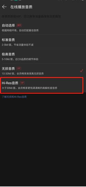 注:网易云音乐表示,旗下拥有百万级Hi-Res曲库,单首音乐体积超过30MB比传统无损音质(10-30MB)更大,拥有比无损音质更高的解析度。网易云音乐Hi-Res音质可能正在灰度测试,部分网友暂无Hi-Res音质选项。
