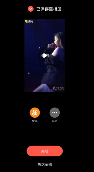 3、导出的视频不仅会保存在手机本地,而且可以通过底端的按钮一键分享到快手等地方,让更多的人看到你的作品!