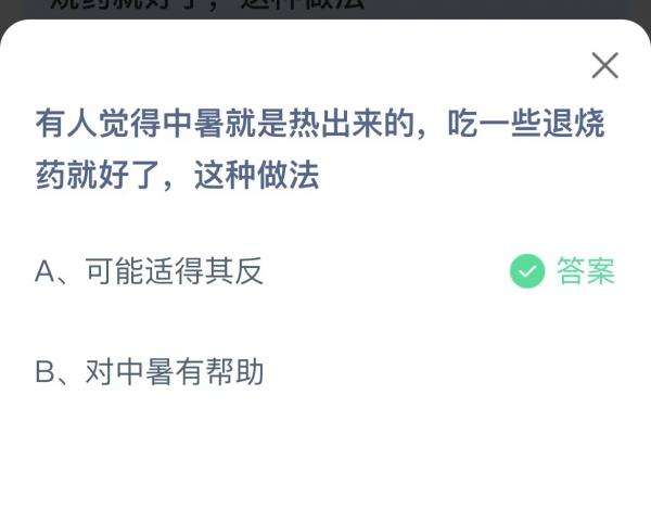 2022支付宝蚂蚁庄园6月28日的题目为:有人觉得中暑就是热出来的吃一些退烧药就好了这种做法?答案是什么呢?很多小伙伴可能还不太清楚。下面小编就为大家带来了正确答案分享,希望能帮助到你。