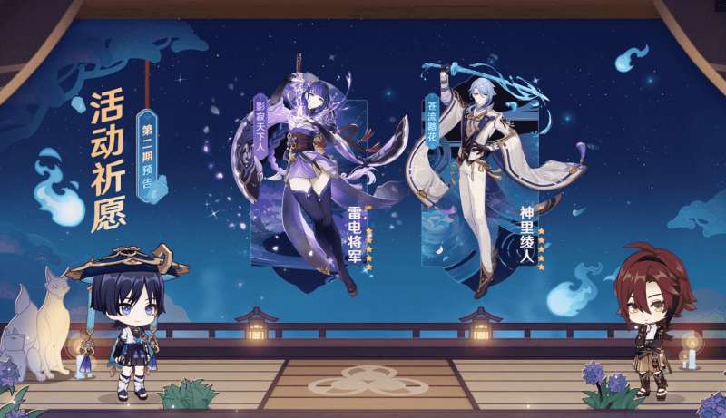 而在版本第二期角色活动祈愿中,角色活动祈愿「影寂天下人」与角色活动祈愿-2「苍流踏花」将会开启,雷电将军与神里绫人会分别迎来概率UP。