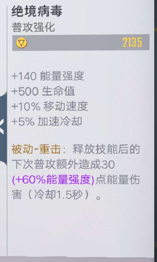 绝境病毒140能量强度和500生命值,10%的移速以及5%的加速冷却这个效果和魔仙子配合效果很好,魔仙子大多数依靠强化普攻伤害减速,这件装备的被动重击使得魔仙子的强化普攻伤害再次得到提升30+60%能量强度点能量伤害,可以把魔仙子强化普攻拉上了另一个层次,还可以把魔仙子的支援能力以及技能的加速冷却减少cd都能得到大幅度能力提升。