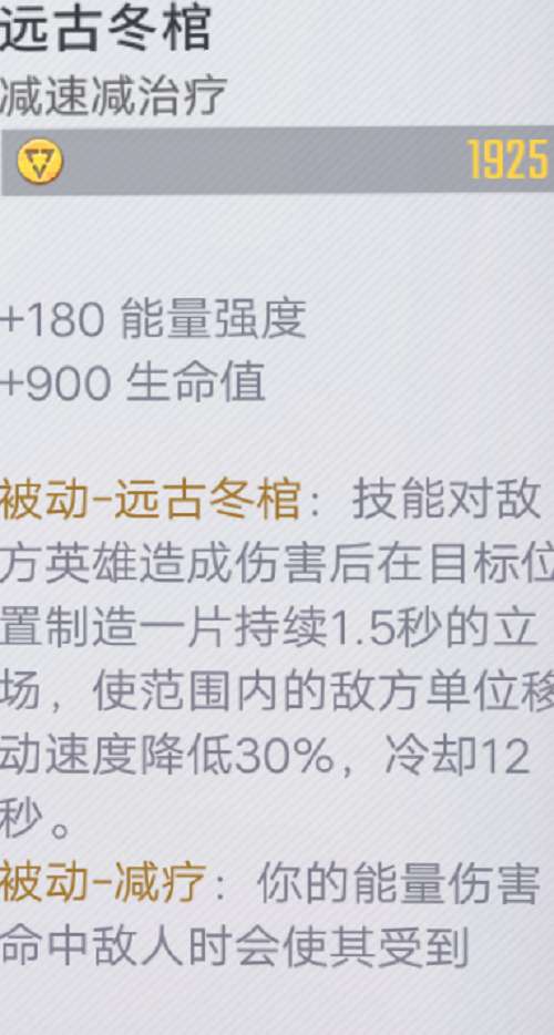 增加180能量强度和900生命值。有着魔仙子的核心――减速,减速效果有着和英雄特质被动一样的群体减速效果,冷却只有12秒,但这一件装备自重要的就是被动――减疗,这件装备简直不敢相信任何能量伤害都可以造成50%减治疗一般的物理型英雄都需要购买雷神之锤来近身承受大量伤害来换取减治疗,能量型英雄攻击范围广可以既保证自己的存活还能大幅度降低对方的治疗,尤其克制曼蒂斯、海拉、刽子手这些英雄。