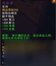 装备:你的有害和增益法术有几率在你目标之间编织一条命运丝线,持续5丝线存在时,相连的盟友会获得545点力量加成。丝线断裂时,敌人会受到43033点宇宙伤害。
