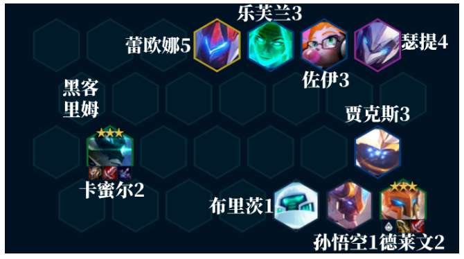 阵容组成:孙悟空、瑟提、蕾欧娜、德莱文、卡蜜尔、贾克斯、佐伊、乐芙兰、布里茨