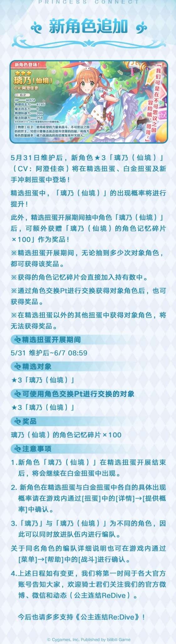 维护结束后,新角色★3「璃乃(仙境)」(CV:阿澄佳奈)即将登场!游戏内将同时开启「璃乃(仙境)」精选扭蛋;同时,「★6才能开花」将追加新角色;个人与行会简介卡将追加【仙境】主题背景,并追加新的游戏内容!