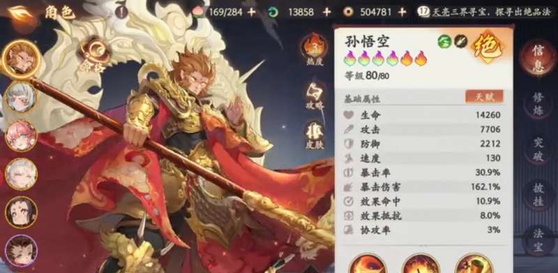 4、还有一个核心C位就是猴哥了,玩西游肯定必玩猴哥这不用咱们脑袋想都知道,猴哥主线是可以白嫖到的,他有群伤自我治疗能力,还有一个单伤的降防能力是极强的,是一个均衡型的一个战士,