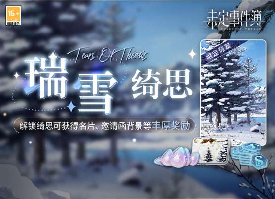 2.9版本更新后,「瑞雪绮思」正式上线。律师可通过解锁绮思获得名片【绮思·瑞雪】、限定邀请函背景【松林雪景】、【女神之泪】等丰厚奖励