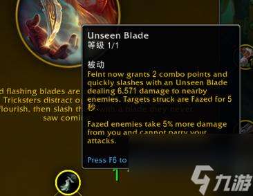 被动:当佯攻激活时受到范围伤害或当闪避激活时闪避伤害,触发无形之刃。这个效果每5秒仅触发一次。