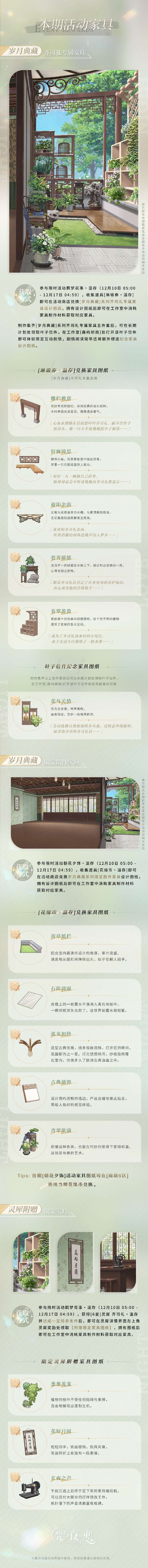 参与限时活动朝花夕饰・温存(12月10日 05:00 - 12月17日 04:59),收集道具[花缘币・温存]即可在活动商店兑换岁月典藏系列限定散件家具设计图纸,拥有设计图纸后即可在工作室中消耗家具制作材料获取对应家具。