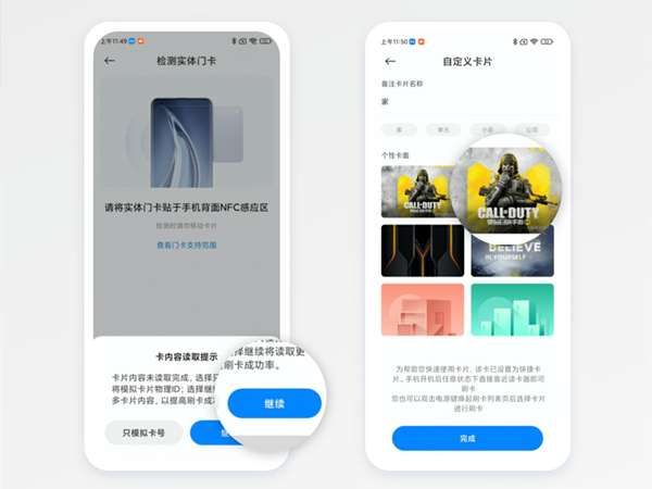 2、在弹窗中找到继续读取卡片内容,并再次将小米智能锁贴近NFC区域,输入卡的信息并选择卡片,点击完成。