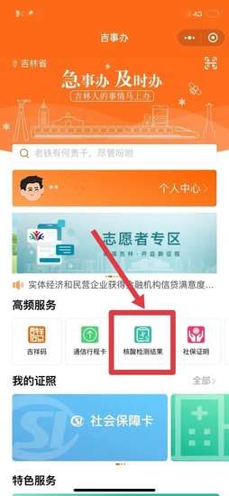 1、打开吉事办,点击红框“核酸检测结果 ”即可查询