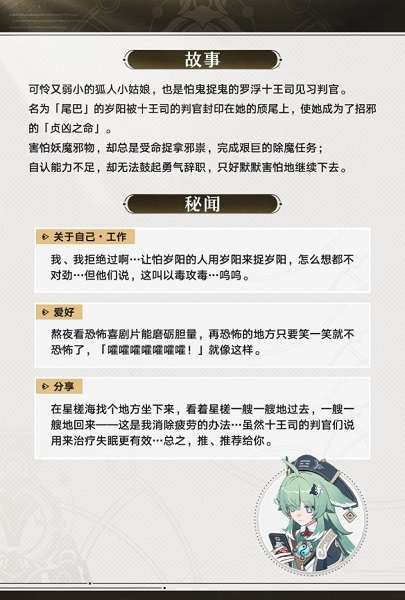 名为「尾巴」的岁阳被十王司的判官封印在她的颀尾上,使她成为了招邪的「贞凶之命」。