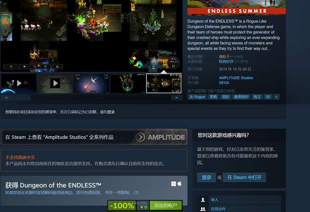 据了解,Rogue-like类的地牢塔防游戏《无尽地牢》在Steam平台开启了限时免费领取活动,感兴趣的玩家可以点击下方链接进入,一键领取入库。