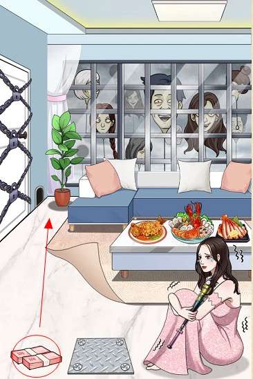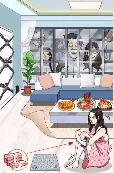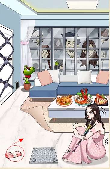6、点击地毯往上划动,把钱拖到地毯下的零食上,变成美食。
