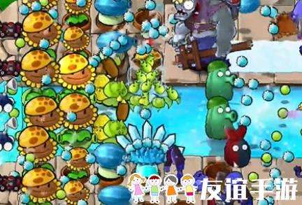 4、在玉米卷香蒲所在列种植四个冰冻西瓜大喷菇,在泳池中种植一个豌豆荚许愿池。