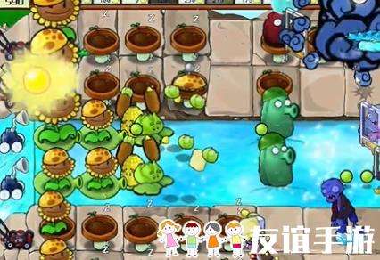 3、继续在左侧种植阳光向日葵,在泳池中补充玉米卷香蒲和高兵菇。