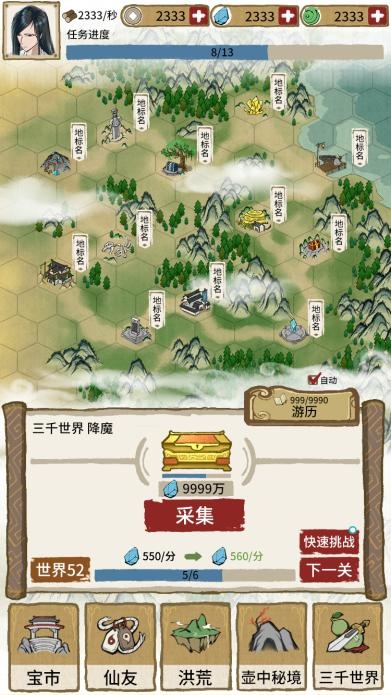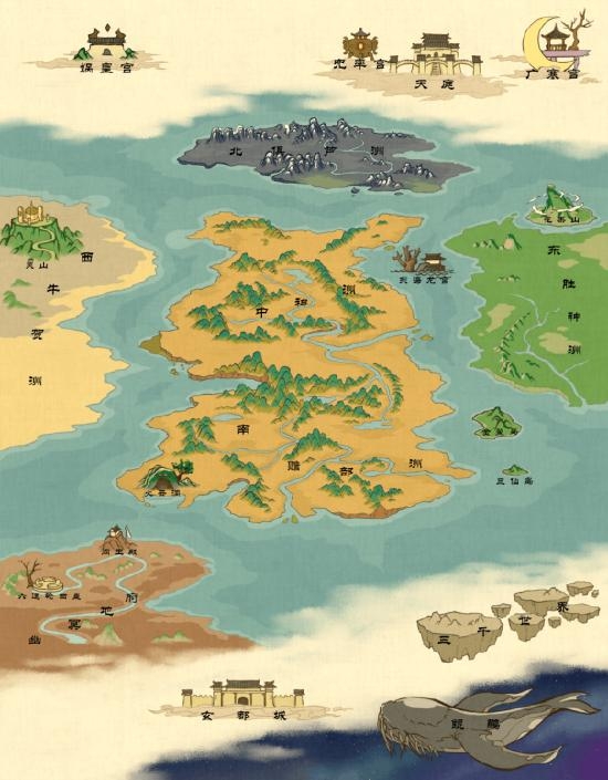 游戏还原了洪荒五部洲与周边世界地理,五部洲:中土神洲,东胜神洲,南瞻部洲,西牛贺洲,北俱芦洲。当然也可以通过挂机逐步占领,自动获取资源。