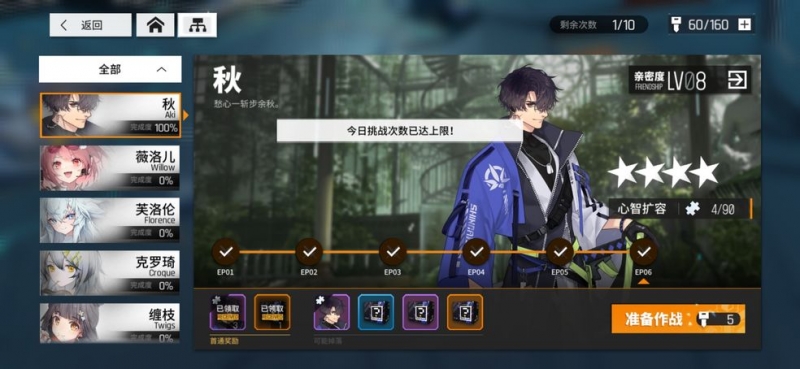其中每关每天只能打一次,一个角色有6关,也就是同一个角色一天最多六次,总数十次