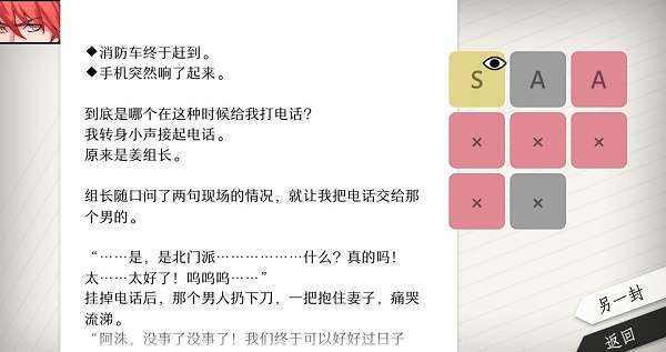 S级结局:消防车终于赶到——手机突然响了起来(完成之后解锁姜白夜的来信,完成姜白夜的第一封来信事件之后再次进入该事件按照该结局重新排列一次即会变成S级)。