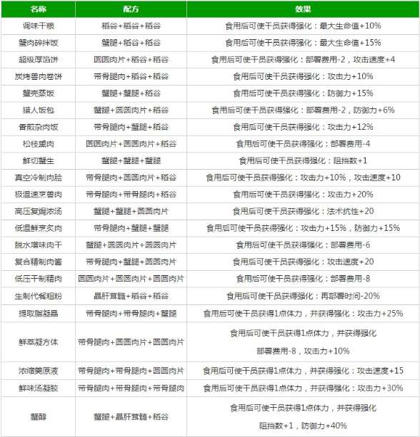 蟹肉碎拌饭:蟹腿+稻谷+稻谷 食用后可使干员获得强化:最大生命值+15%