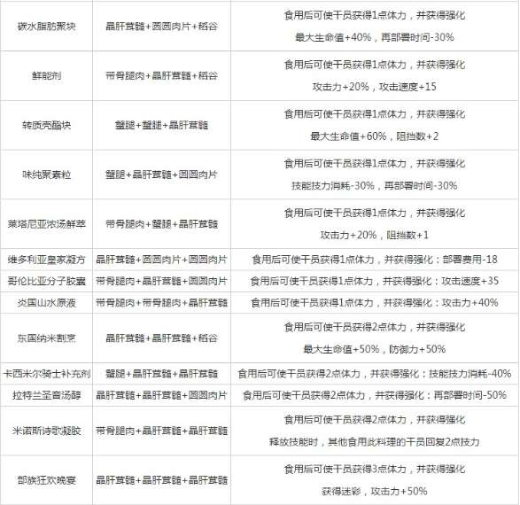 莱塔尼亚浓汤鲜萃:带骨腿肉+蟹腿+晶肝茸髓 食用后可使干员获得1点体力,并获得强化:攻击力+20%,阻挡数+1
