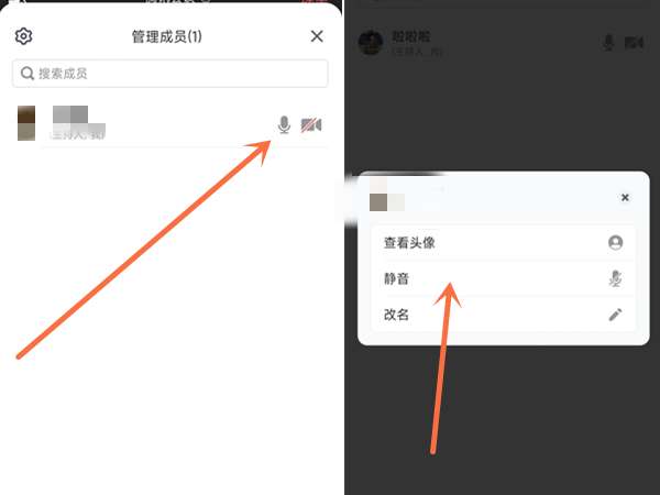 3、也可以单独设置,选择需要禁言的用户,点击麦克风图标,再点击静音即可。