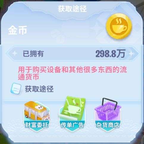 3、成长初期金币缺乏,每升一级买设备、家具、升员工等都需要大量的金币,这就需要卡级,等攒到几千、几万、几十万(金币需求随等级提升)的金币再升级,金币可以从主线任务、活动签到、财富委托、发传单等地获取。金币问题在进入中后期好转。