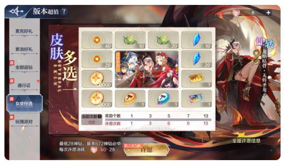 消耗指定神钻可进行一次许愿,抽奖次数越高抽到的奖励数量越多,抽到皮肤的概率越高,第13次(最低28神钻,最高672神钻)必定可以获得大奖【性转女皮自选宝箱*1】,抽中皮肤大奖,进度重置,可再次抽取。