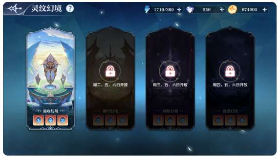 其中一共有4种幻境,分别是:强攻幻境、御守幻境、制衡幻境、通感幻境,分别在每周一、二、三、四开启,每周五、六、日将全部开启。灵纹幻境分为单人模式、组队模式2种模式。快叫上你的小伙伴,一起挑战吧!
