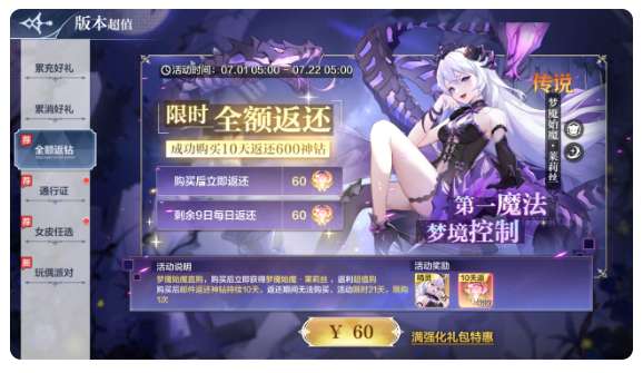 活动内容:梦魇始魔直购,购买后立即获得梦魇始魔•莱莉丝,返利超值购,购买后邮件返还神钻持续10天。