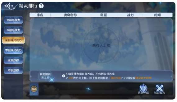 2、总战力,包含精灵自身养成和公共养成,根据战力由高到低排名,分为全服和本服榜