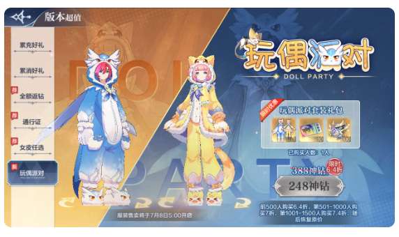活动内容:最新时装玩偶派对时装将于7月8日5:00-7月22日5:00开放售卖,原价388神钻,前500人购买享受6.4折,仅需248神钻;第501-1000人购买享受6.9折,仅需270神钻;第1001-1500人购买享受7.4折,仅需288神钻,随后恢复原价。