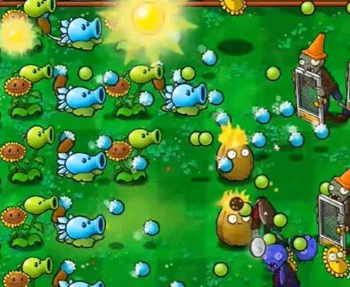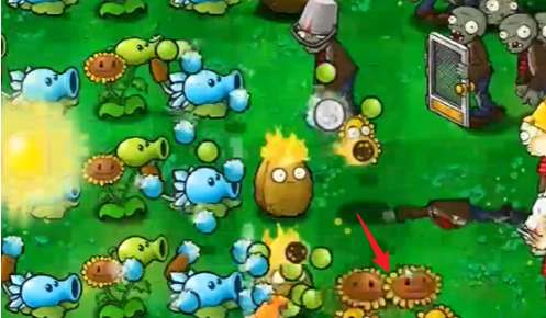 3、第一批僵尸出现后将香蒲、寒冰射手和阳光炸弹放入下图的位置。