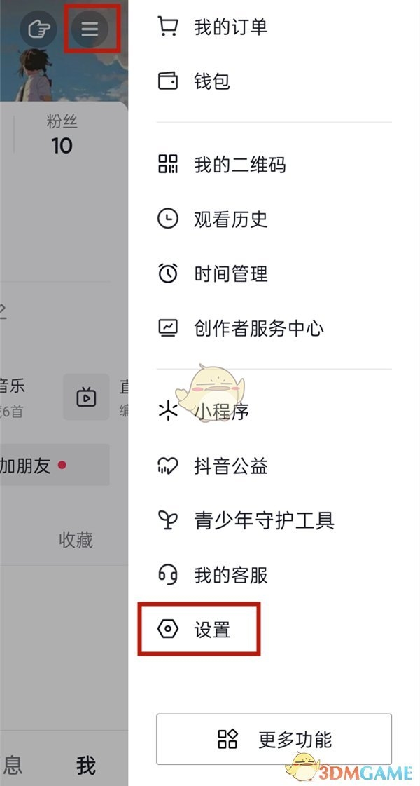 1、打开抖音我页面的右上角的三横图标,点击设置。